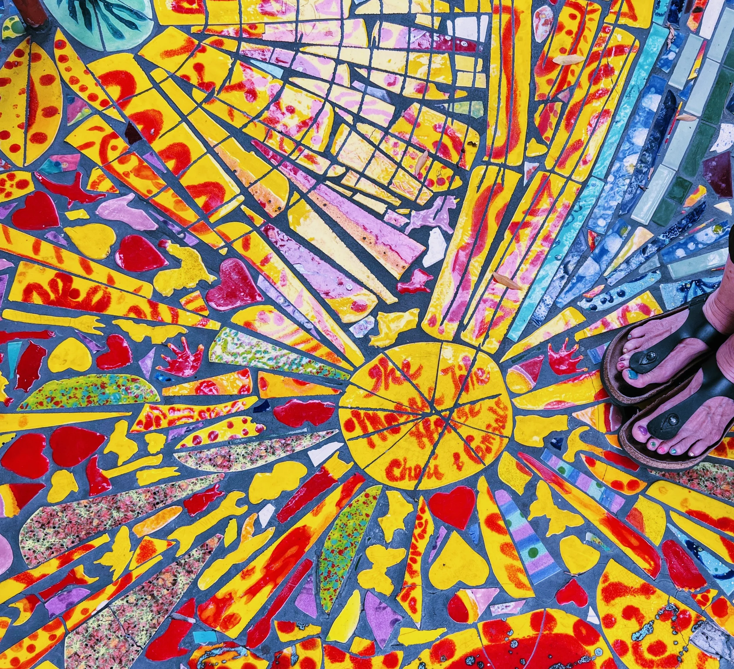 This bright yellow tiled path running along the right side of the house called to me. Might not be the yellow brick road but it comes close with its irresistible allure. It’s as you walk along and look at the combination of wise sayings, inspirational quotes, every day household items and colorful tiles that the full impact of what you’ve come to see starts to sink in.