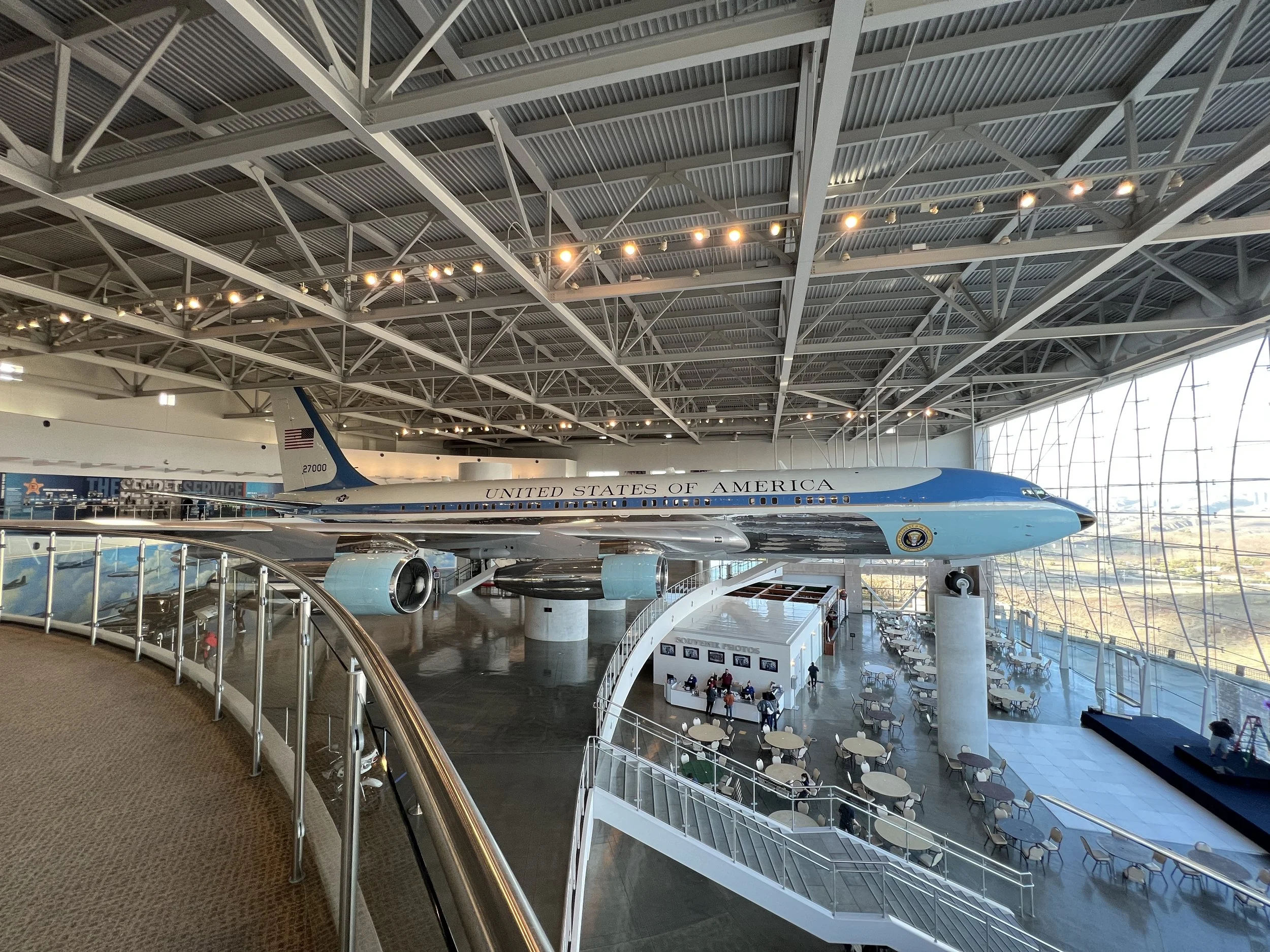 Air Force One pavilion. Visitors have the opportunity to walk through this floating white house and see how business was conducted. As we walked through the back of the plane where the press corps usually travel, the guide told us that President Reagan decided that the Press Corp should pay for the privilege of riding on Airforce One.