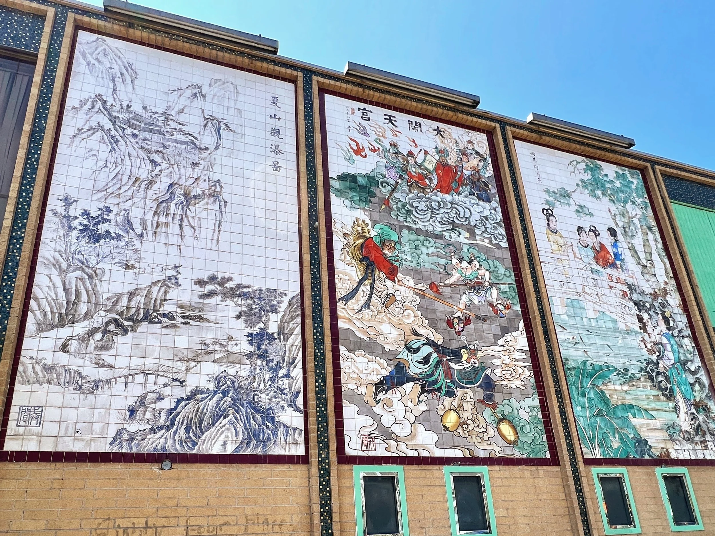 Beautiful tile murals on a wall outside an abandoned building along Broadway as you walk from the Dragon Gate towards the Central Plaza.